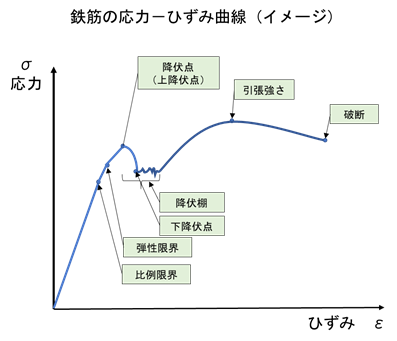 - 鋼材(軟鋼)の引張試験を行うと下図のような応力ーひずみ曲線が得られる.
