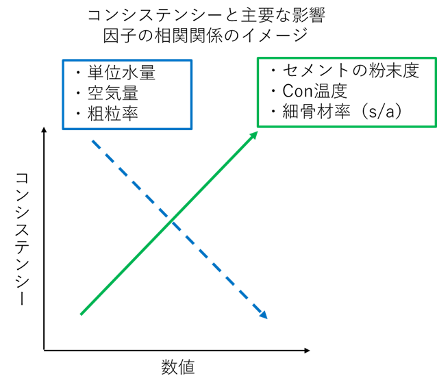 主要な各影響因子が示す数値の大小とコンシステンシー(流動に対する抵抗性)の相関イメージが下図のグラフです。