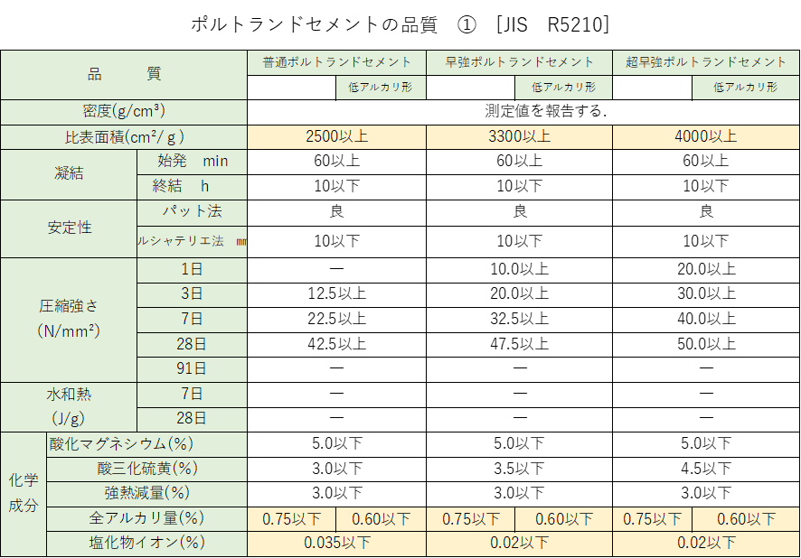 ポルトランドセメントの品質は、JIS R5210 で決められています。
