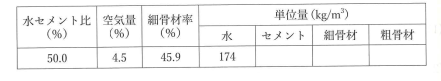 - 単位重量や水セメント比、細骨材率などから各材料の単位量を算出。