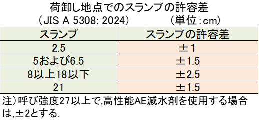 - 荷卸し地点での値を指定(ポンプ圧送による変化を考慮)下表による。