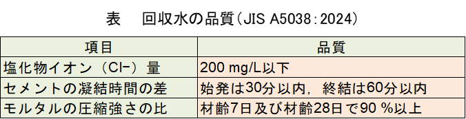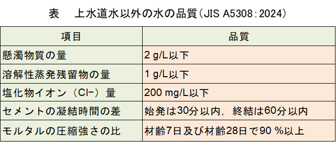 レディーミクストコンクリートの練混ぜ水に用いる水は,JIS A5038 附属書C(規定)において、上水道水、上水道水以外の水、回収水の3種類が規定されている.