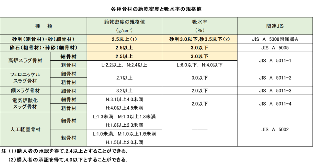下表は、各種骨材の絶乾密度と吸水率の規格値をまとめたものです。