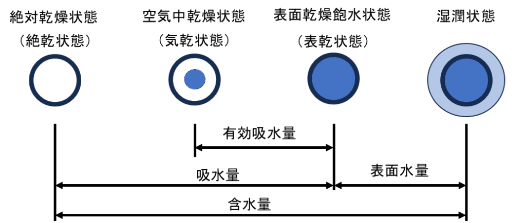 - 骨材が100%吸水し、骨材内部の空隙が水で満たされ、かつ表面は乾燥した状態を表面乾燥飽水状態(表乾状態)という。