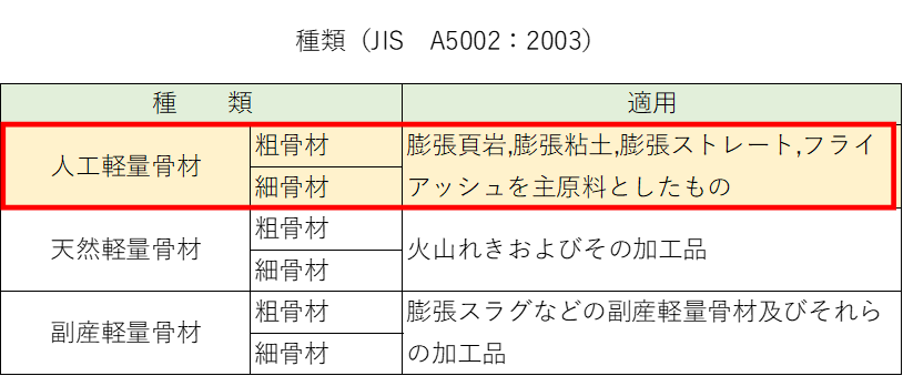 軽量骨材の種類軽量骨材の種類は、JIS で、下表のように分類されています。