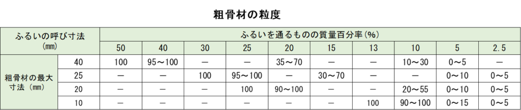 この表に示される粒度範囲にある骨材を用いれば、比較的少ない単位水量と単位セメント量で、所用のワーカビリティーをもったコンクリートを造ることが出来、また、近年、良質なコンクリート用骨材の入手が困難に状況において、種々の骨材を混合して使用する場合の粒度についてもが下表が使用可能であることが標準示方書で示されています。