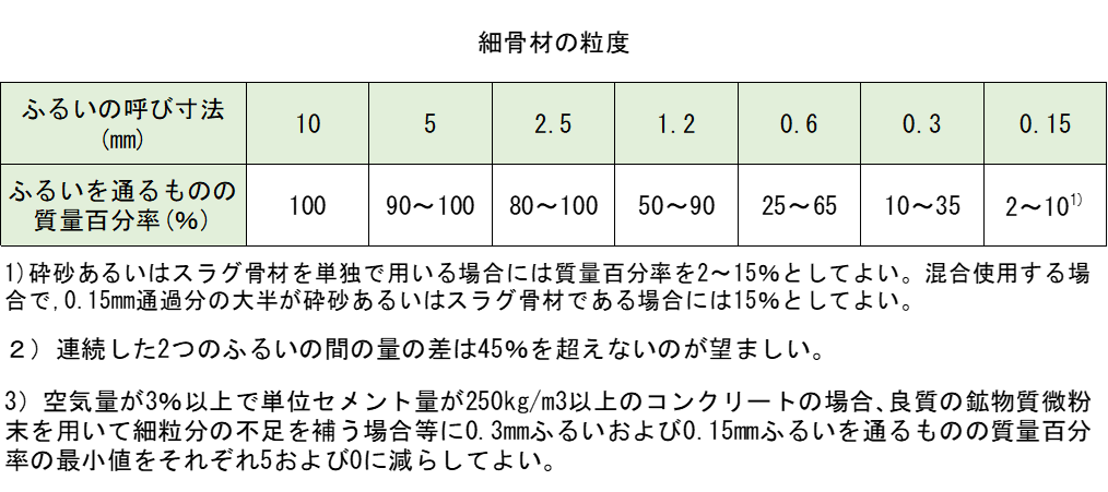 コンクリート標準示方書〔施工編〕では、”配合選定の際に用いた細骨材に対して粗粒率が0.2以上変化するとワーカビリティーに及ぼす影響も大きくなる。”と記載されています。
