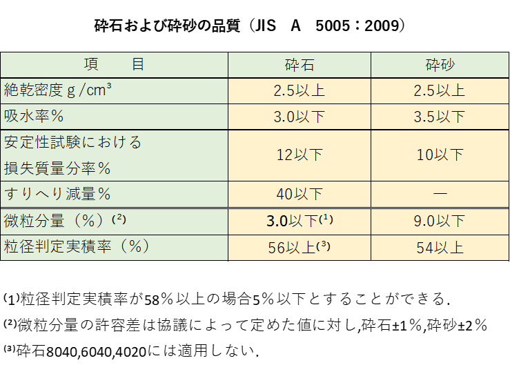 - コンクリートに用いる細骨材及び粗骨材は,清浄,堅硬,劣化に対する抵抗性をもち化学的および物理的に安定し,有機不純物,塩化物等を有害量以上含まないものとする。