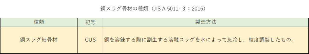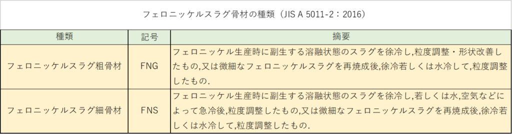 金属精錬副産物。高炉スラグ、フェロニッケル、銅スラグ、電気炉酸化スラグなど。JIS A 5011-1~4。