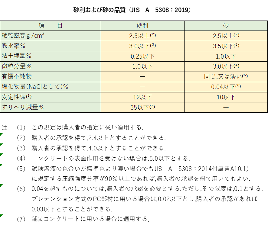 レディーミクストコンクリート用の砂・砂利の品質がJIS A 5308:2019で規定されています。