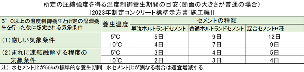 - セメントの種類や養生温度に応じて、養生期間の目安が示されています。