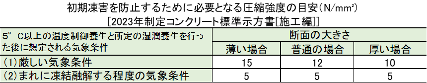 - コンクリートが圧縮強度5.0N/mm²に達するまで、凍結させないように養生する必要があります(JASS 5)。