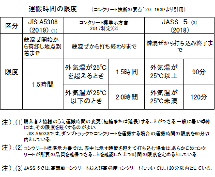 練り混ぜたコンクリートは,一般に時間とともにスランプや空気量が減少するので,レディーミクストコンクリートのJIS,コンクリート標準示方書,JASS 5では、下表のように運搬時間の限度を定めています。