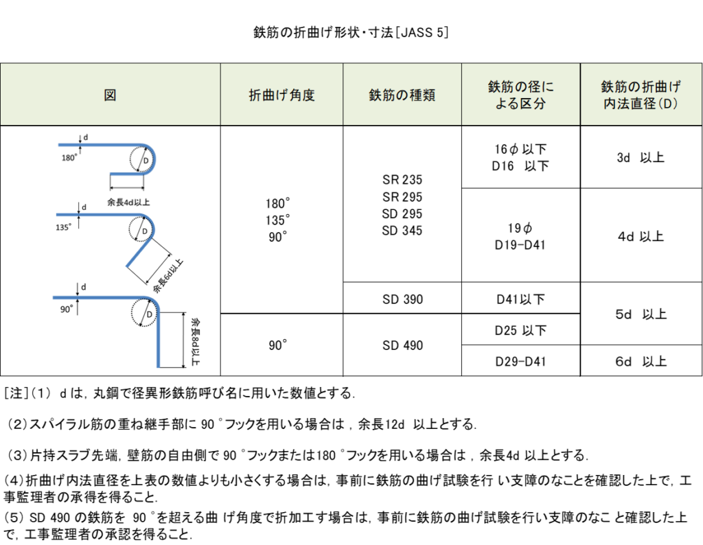 鉄筋の曲げ加工は、「コンクリート標準示方書(設計編)」に定められた半径以上で行う必要があります。また、「JASS 5」にも図示された基準があります。