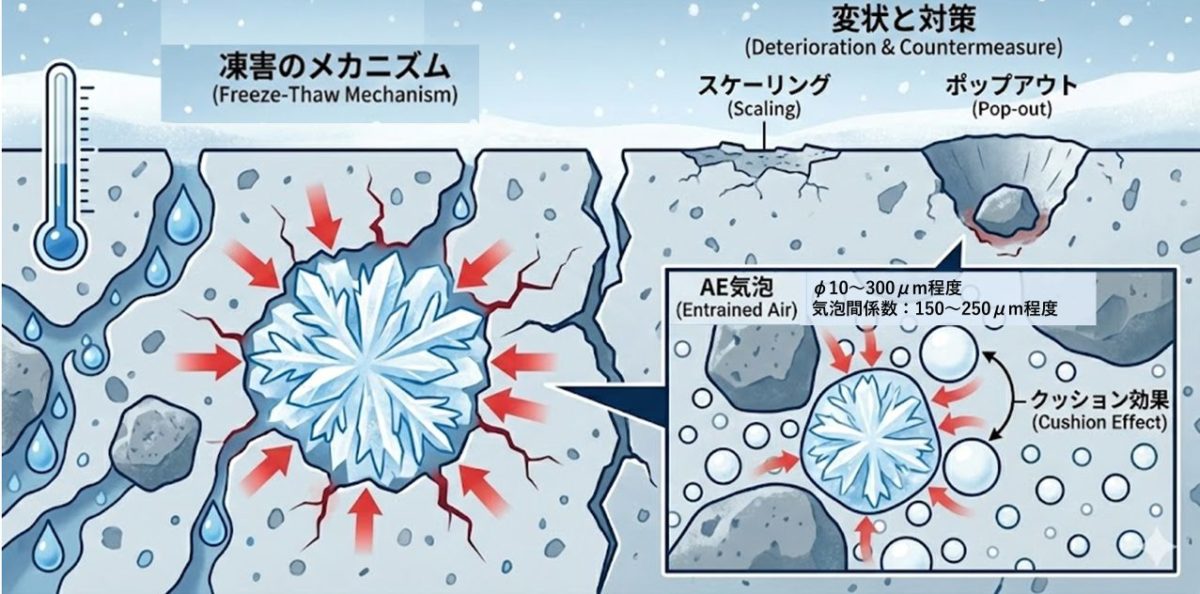 本稿では、凍害特有の**「スケーリング」「ポップアウト」の見極め方、コンクリートを凍害から守る「連行空気(AE)」のメカニズム、そして合否を分ける「気泡間隔係数」**を整理します。