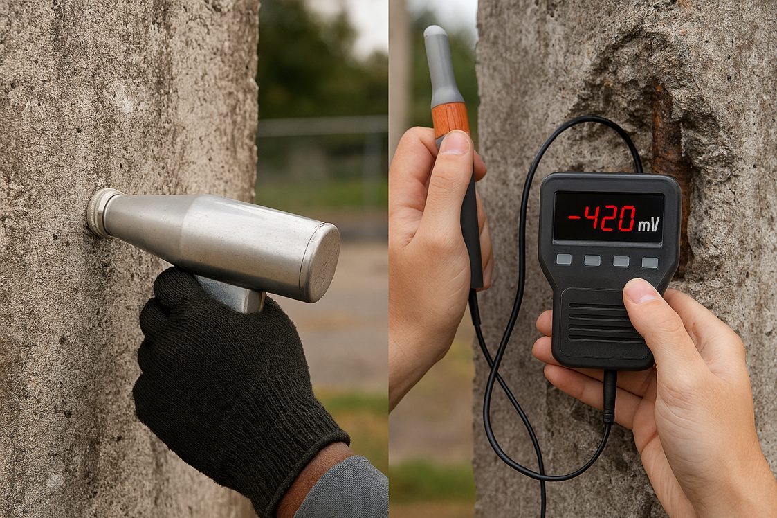 • 照合電極(一般に銅・硫酸銅電極:CSE)を表面に当て、内部鉄筋との電位差(自然電位)を測定します。