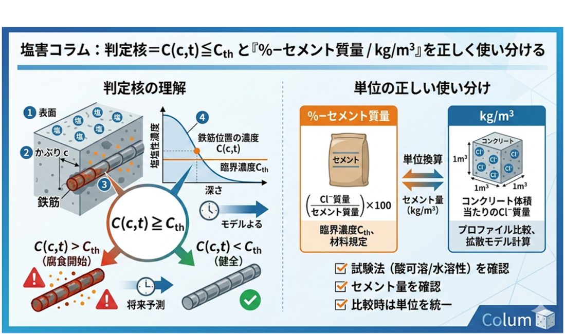 判定核 \(C(c,t) \stackrel{>}{<} C_{th}\)と「%–セメント質量」「kg/m³」の正しい使い分け