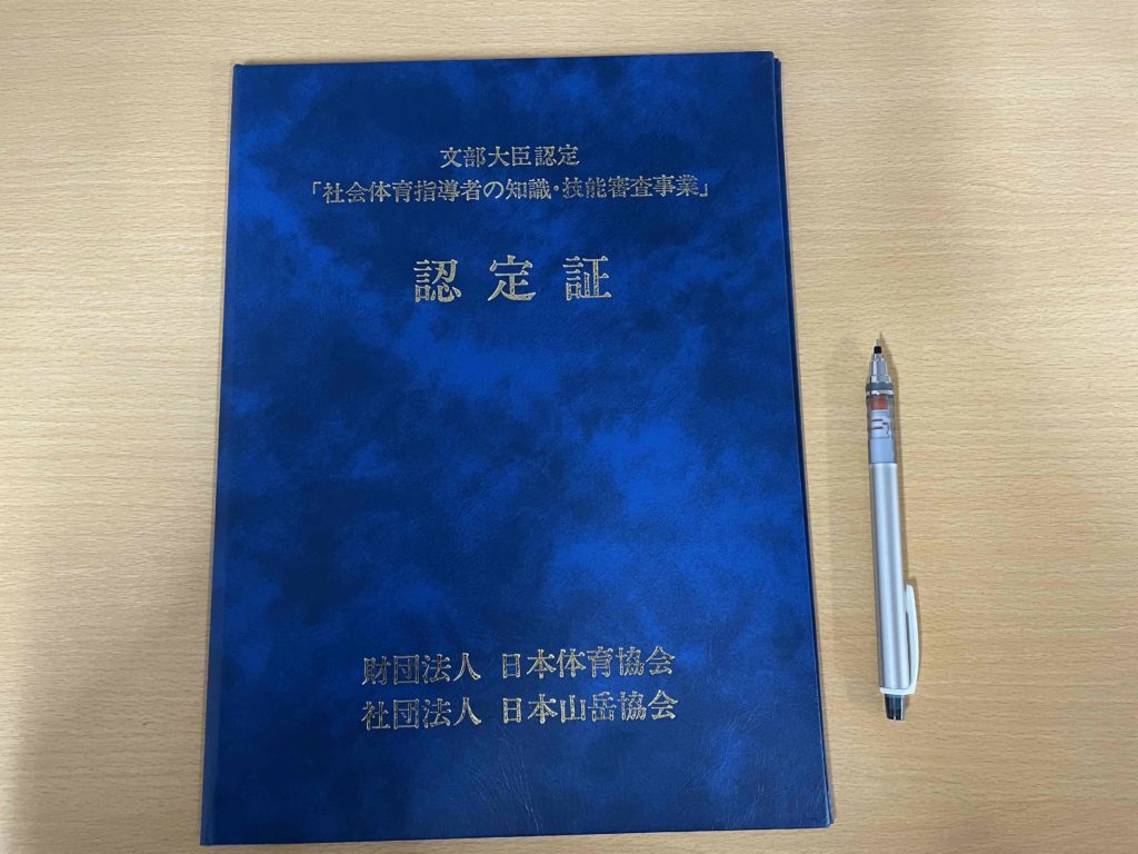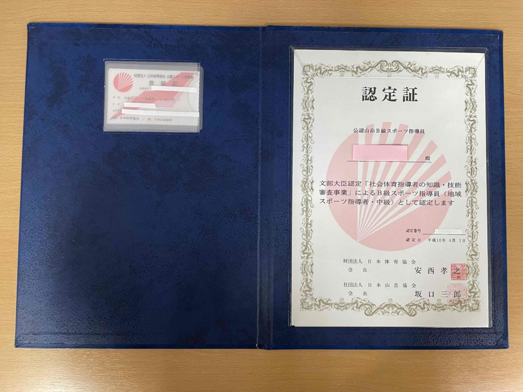 ある日、所属していた山岳会の先輩から「指導員の資格を取ってこい!」と推薦され、講習と試験を経て「公認山岳B級スポーツ指導員」の資格を取得しました。