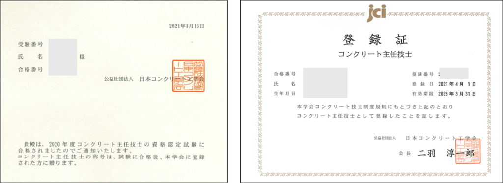合格通知と登録証(B5サイズ)を今でも大切に保管しています。 - 2020年:コンクリート主任技士 合格
